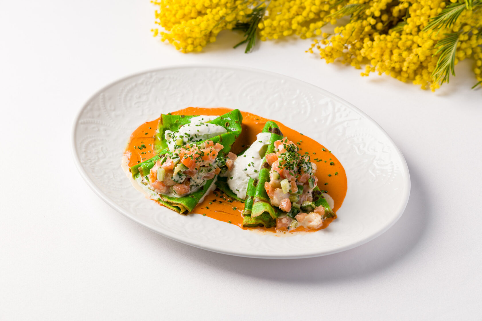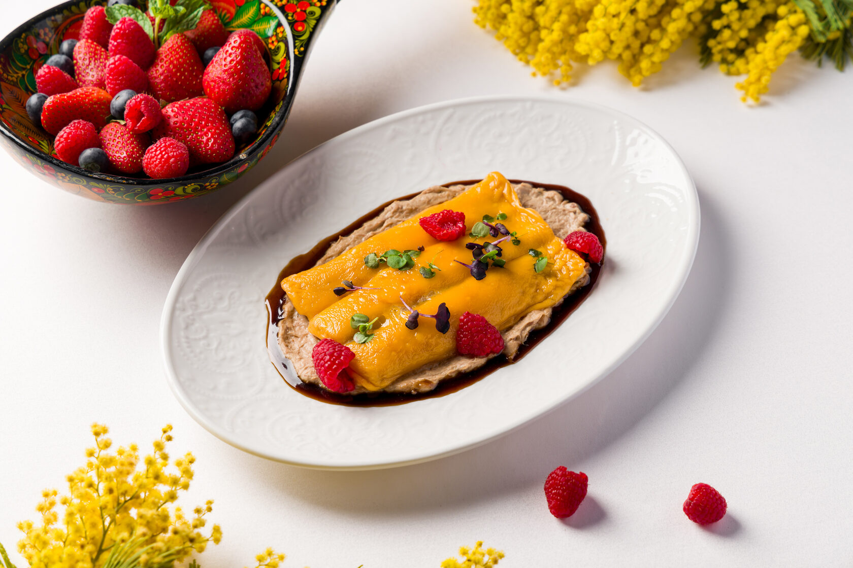 Под руководством шеф-повара Алексея Чигака классические русские блины обретают современное звучание, сохраняя при этом узнаваемую душевность. В масленичном меню нет прямых цитат и буквальных повторов — здесь традиция переосмысляется через текстуры, соусы и сочетания. Так, румяные блинчики с ростбифом подают с насыщенным соусом из белых грибов (840 руб.) — плотным, согревающим, словно созданным для поздней зимы. Более легкий, но не менее выразительный вариант — зеленые блины со шпинатом (980 руб.), в которых сочетаются слабосоленый лосось, рубленые жареные креветки и свежий огурец, а сливочный соус том ям добавляет неожиданную пряную ноту.