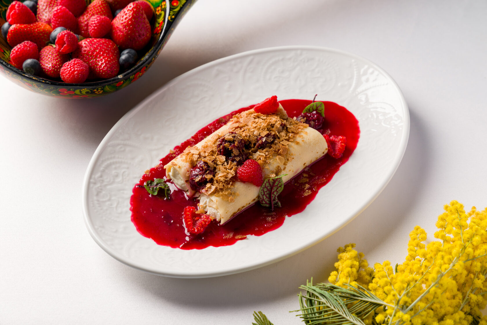 Не забыли в «Кафе Чайковский» и о десертной стороне Масленицы. Налистники с начинкой из двух видов творога и апельсиновыми цукатами (720 руб.) запекают под ароматным апельсиновым соусом, а блины с «пьяной» вишней (640 руб.), крем-чизом и белым шоколадом подают с вафельной крошкой и малиной — как финальный аккорд масленичного застолья.